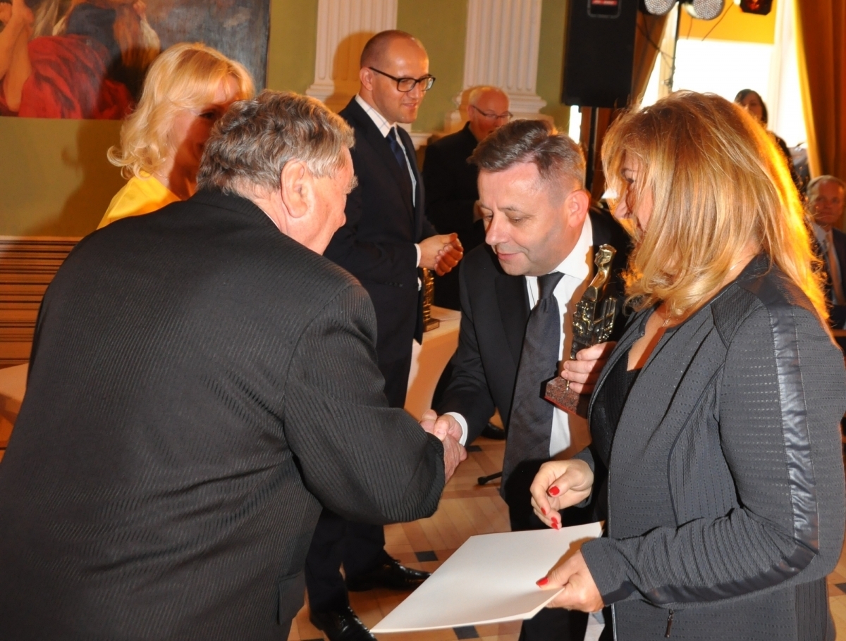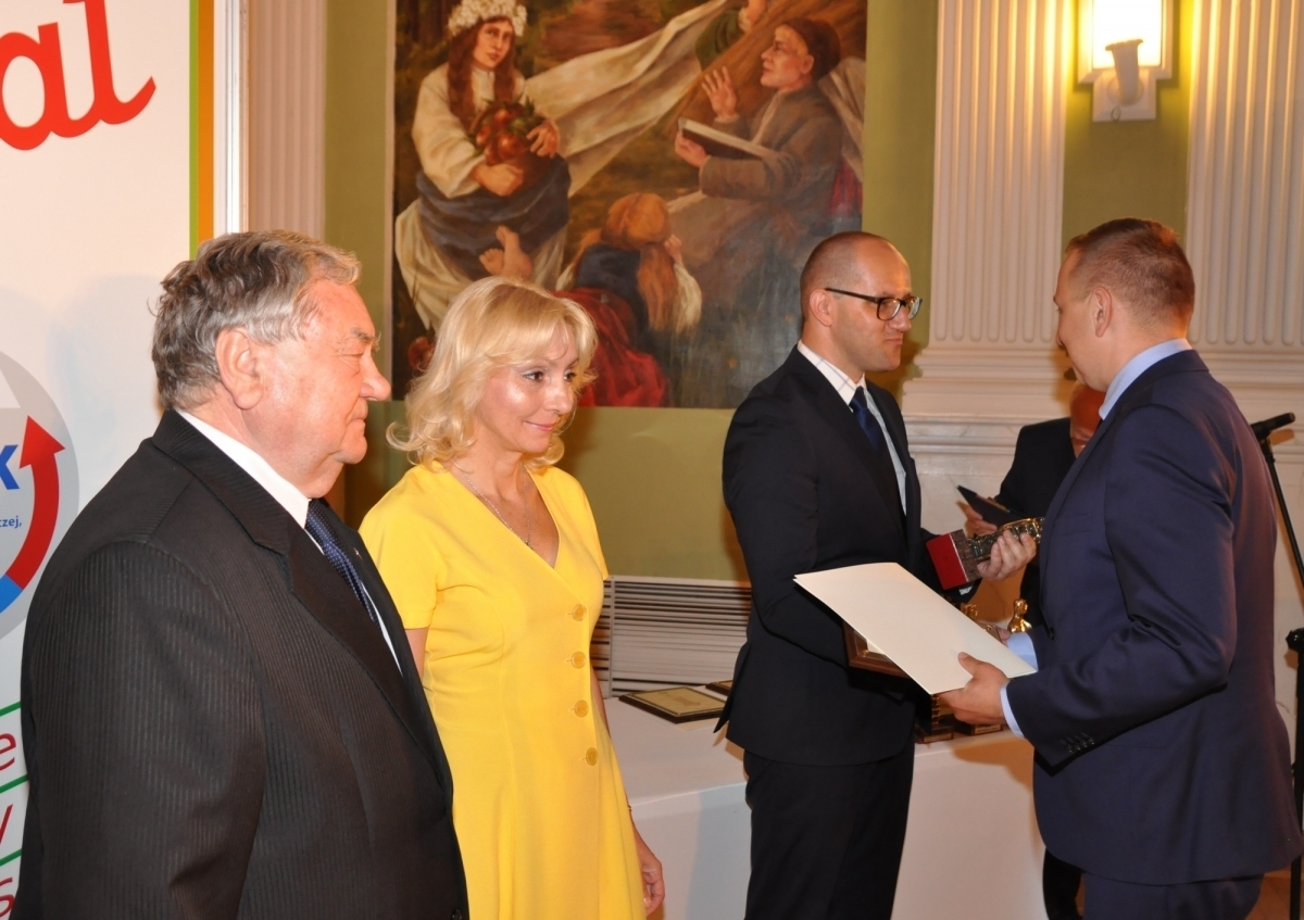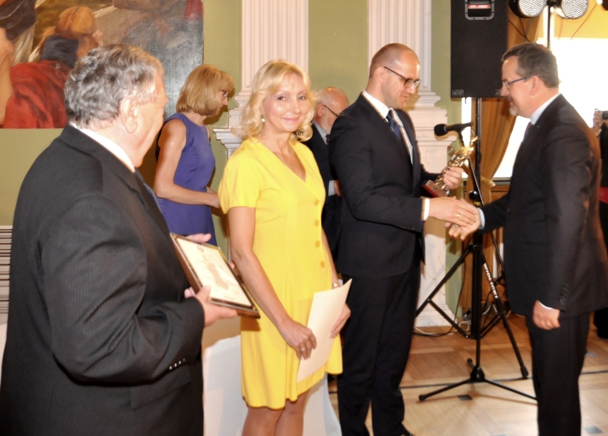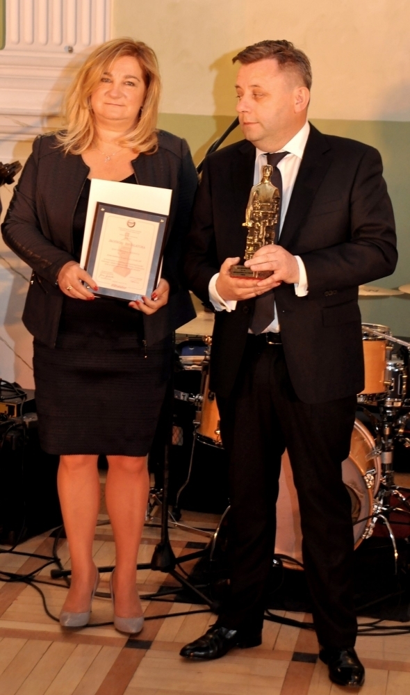 Statuetki wraz z okolicznościowymi dyplomami wręczali (od prawej strony): Wiceminister Infrastruktury i Budownictwa Pan Tomasz Żuchowski, Redaktor Naczelna „Polskiego Instalatora” Pani Joanna Jankowska i Prezydent Korporacji Pan Tadeusz Jassa.