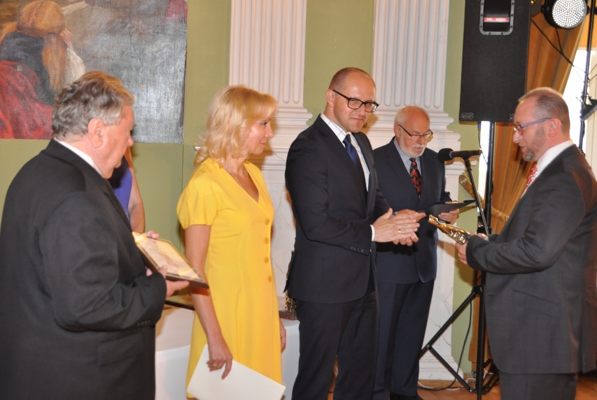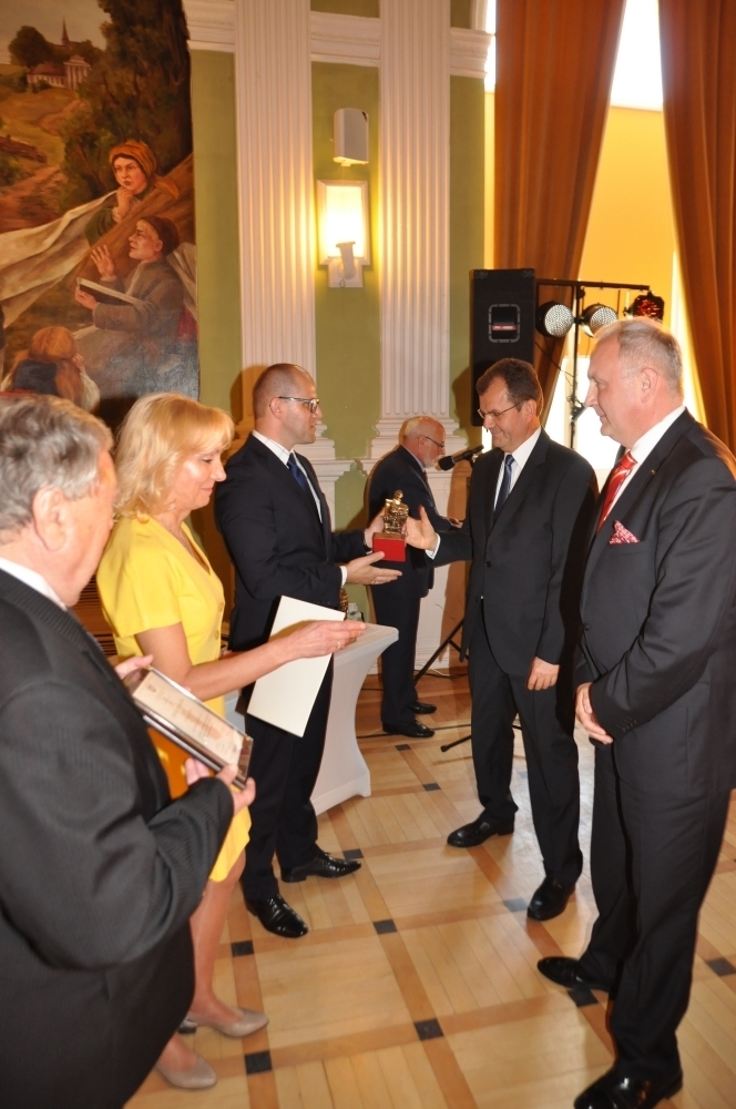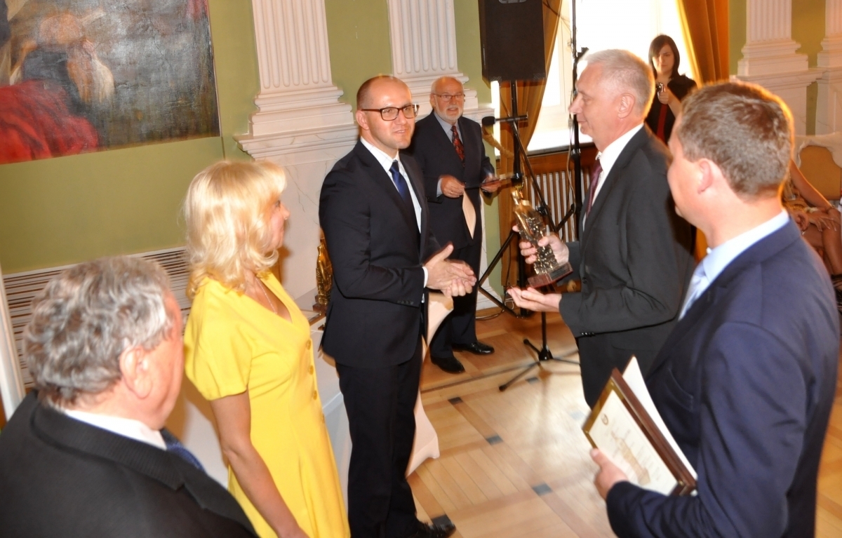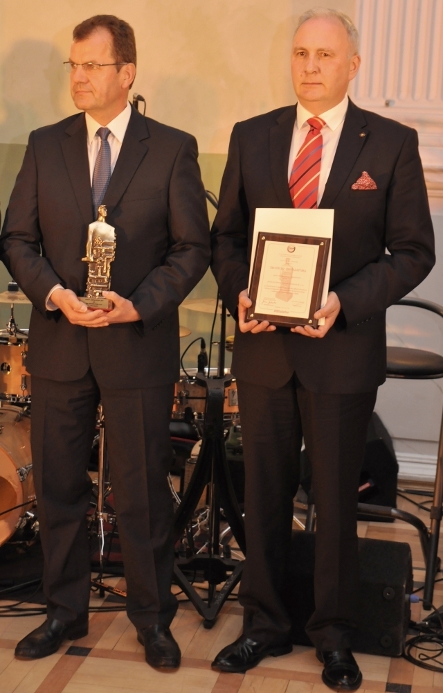 Statuetki wraz z okolicznościowymi dyplomami wręczali (od prawej strony): Wiceminister Infrastruktury i Budownictwa Pan Tomasz Żuchowski, Redaktor Naczelna „Polskiego Instalatora” Pani Joanna Jankowska i Prezydent Korporacji Pan Tadeusz Jassa.